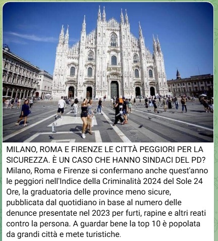 17 settembre. MILANO, ROMA E FIRENZE LE CITTÀ PEGGIORI PER LA SICUREZZA. È UN CASO CHE HANNO SINDACI DEL PD? Milano, Roma e Firenze si confermano anche quest’anno le peggiori nell’Indice della Criminalità 2024 del Sole 24.