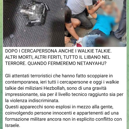 18 settembre. DOPO I CERCAPERSONA ANCHE I WALKIE TALKIE. ALTRI MORTI, ALTRI FERITI, TUTTO IL LIBANO NEL TERRORE. QUANDO FERMEREMO NETANYAHU?