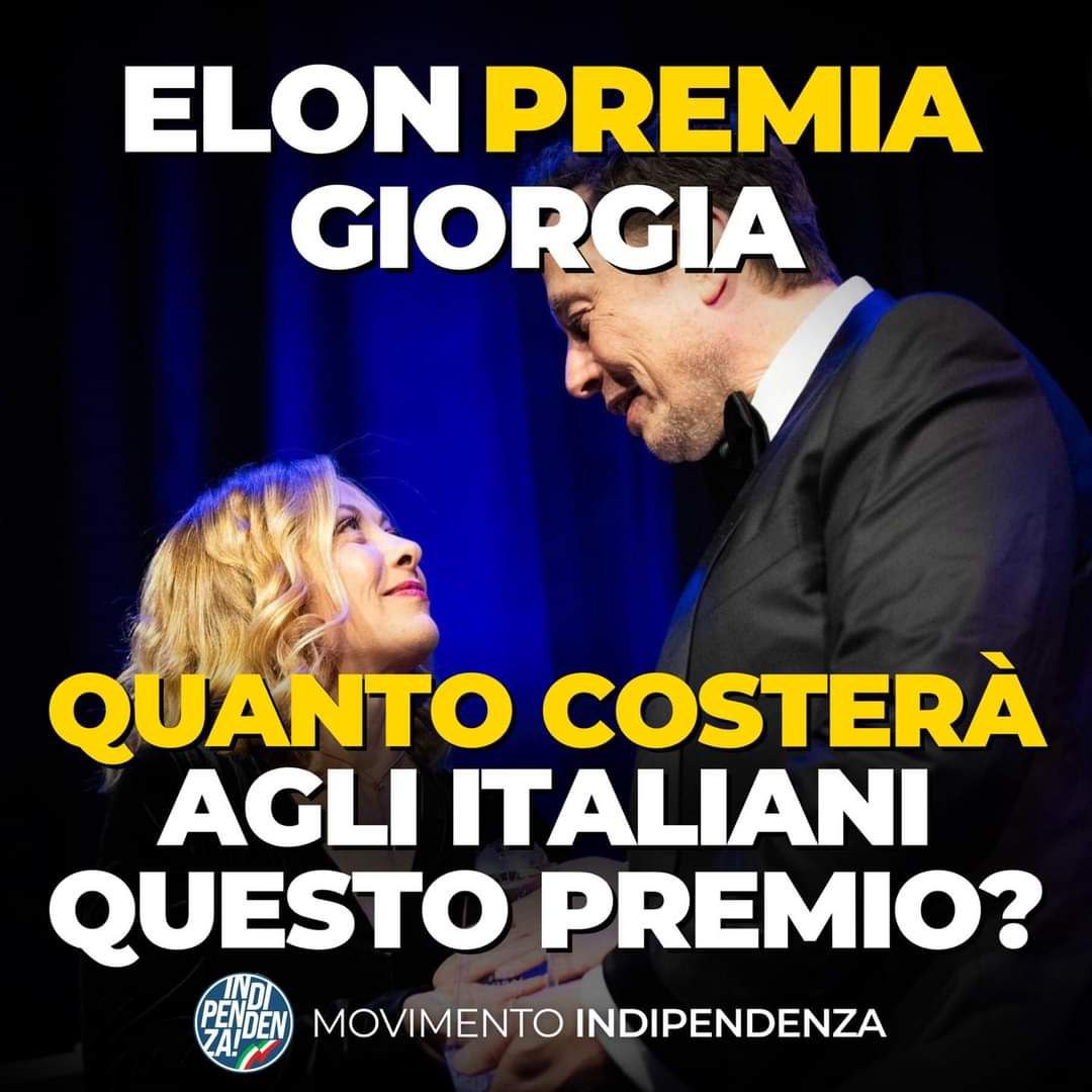 24 settembre. ELON PREMIA GIORGIA, QUANTO COSTERÀ AGLI ITALIANI QUESTO PREMIO? Elon Musk ha premiato ed elogiato entusiasticamente Giorgia Meloni per “il suo forte sostegno all’Unione Europea e all’alleanza transatlantica”.