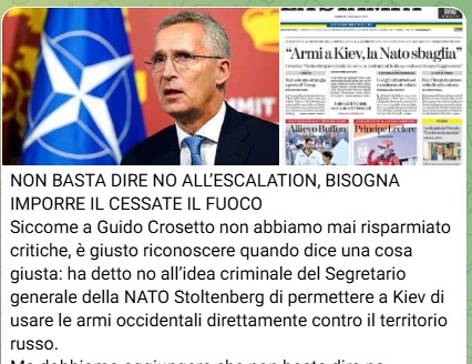 26 maggio. NON BASTA DIRE NO ALL’ESCALATION, BISOGNA IMPORRE IL CESSATE IL FUOCO Siccome a Guido Crosetto non abbiamo mai risparmiato critiche, è giusto riconoscere quando dice una cosa giusta: ha detto no all’idea criminale del Segretario generale della NATO Stoltenberg di permettere a Kiev di usare le armi occidentali direttamente contro il territorio russo.
