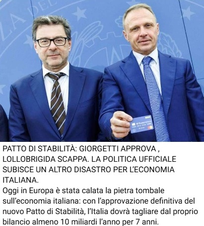 29 aprile. PATTO DI STABILITÀ: GIORGETTI APPROVA, LOLLOBRIGIDA SCAPPA. LA POLITICA UFFICIALE SUBISCE UN ALTRO DISASTRO PER L’ECONOMIA ITALIANA.