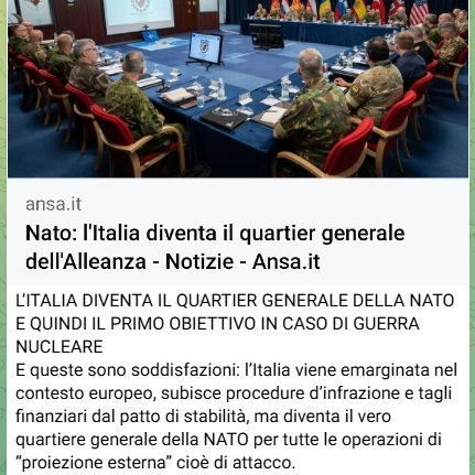 3 luglio. L’ITALIA DIVENTA IL QUARTIER GENERALE DELLA NATO E QUINDI IL PRIMO OBIETTIVO IN CASO DI GUERRA NUCLEARE E queste sono soddisfazioni: l’Italia viene emarginata nel contesto europeo, subisce procedure d’infrazione e tagli finanziari dal patto di stabilità, ma diventa il vero quartiere generale della NATO per tutte le operazioni di “proiezione esterna” cioè di attacco.