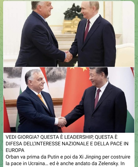 9 luglio. VEDI GIORGIA? QUESTA È LEADERSHIP, QUESTA È DIFESA DELL’INTERESSE NAZIONALE E DELLA PACE IN EUROPA Orban va prima da Putin e poi da Xi Jinping per costruire la pace in Ucraina… ed è anche andato da Zelensky. In questo modo sta dando un grande valore alla Presidenza ungherese del Consiglio europeo e sta dando centralità politica ed economica alla sua Nazione.