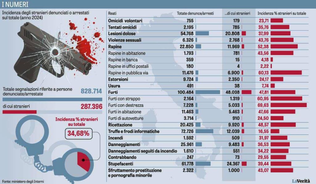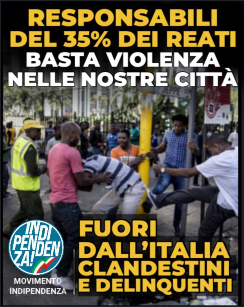 Il 35% dei reati in Italia è compiuto da stranieri (che rappresentano circa l’8.5% della popolazione), il 60% delle rapine per strada, il 61% dei furti con strappo sono opera di questi “ospiti” che, non contenti di vivere grazie all’assistenza dello Stato, depredano le nostre città ei nostri quartieri. Non è più accettabile che chi, entrato clandestinamente in casa nostra, ospitato e sfamato a spese degli italiani, si senta legittimato a depredare per strada il nostro popolo. Fuori dall’Italia i clandestini, chi compie reati e chi pensa di poterci imporre il proprio stile di vita barbarico.
