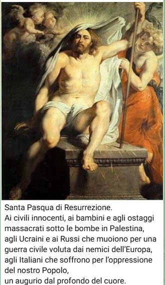 Santa Pasqua di Resurrezione. Ai civili innocenti, ai bambini e agli ostaggi massacrati sotto le bombe in Palestina, agli Ucraini e ai Russi che muoiono per una guerra civile voluta dai nemici dell’Europa, agli Italiani che soffrono per l’oppressione del nostro Popolo, un augurio dal profondo del cuore.